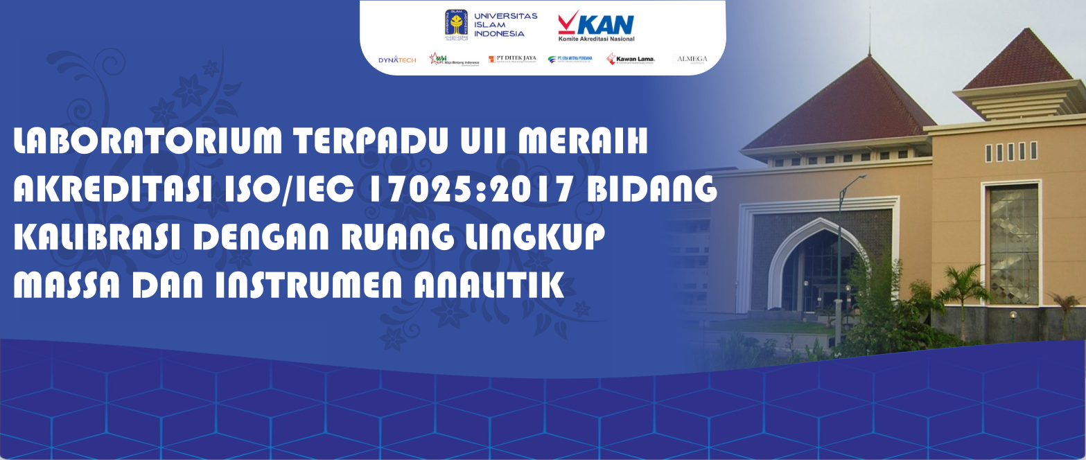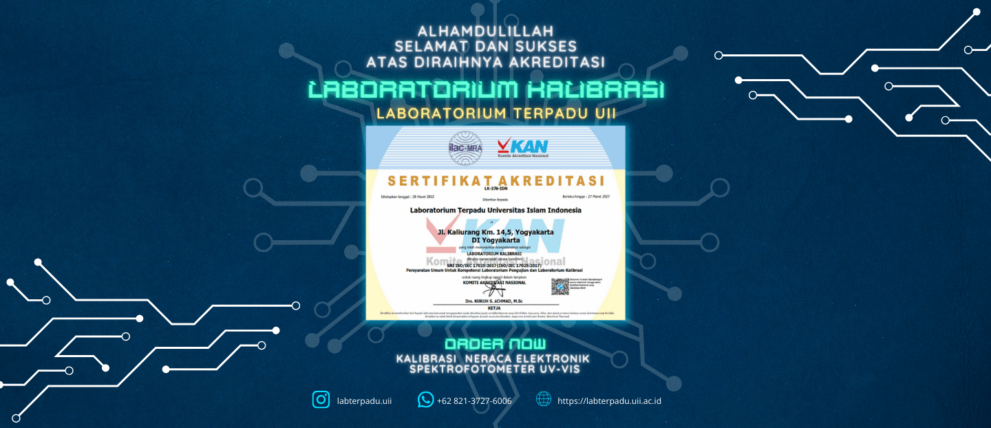 Laboratorium Terpadu telah terakreditasi ISO/IEC 17025:2017 dengan No. LP-478-IDN (Pengujian) dan LK-376-IDN (Kalibrasi) sehingga proses pengujian kimia dan kalibrasi alat ukur terjamin kualitas mutunya oleh Komite Akreditasi Nasional (KAN). Sebagai salah satu unit kerja di lingkungan Universitas Islam Indonesia, Laboratorium Terpadu berkomitmen memberikan layanan pengujian dan kalibrasi yang akurat, tepat waktu serta berintegritas bagi mahasiswa, dosen, industri, instansi maupun masyarakat umum. Dalam bidang pendidikan, kami melayani praktikum kimia dasar dan fisika dasar bagi mahasiswa internal maupun maupun Perguruan Tinggi lainnya.